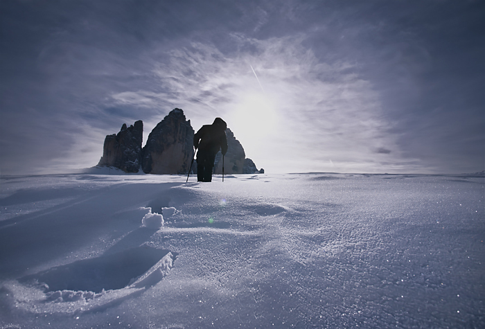 In the morning, the clouds were laying somewhere down in the valley and the sun constantly changed the colours of the snow-capped peaks of the Dolomites. Wind, sun and snow skilfully polish every edge of the rocks. So much splendour cannot be seen on the plains.